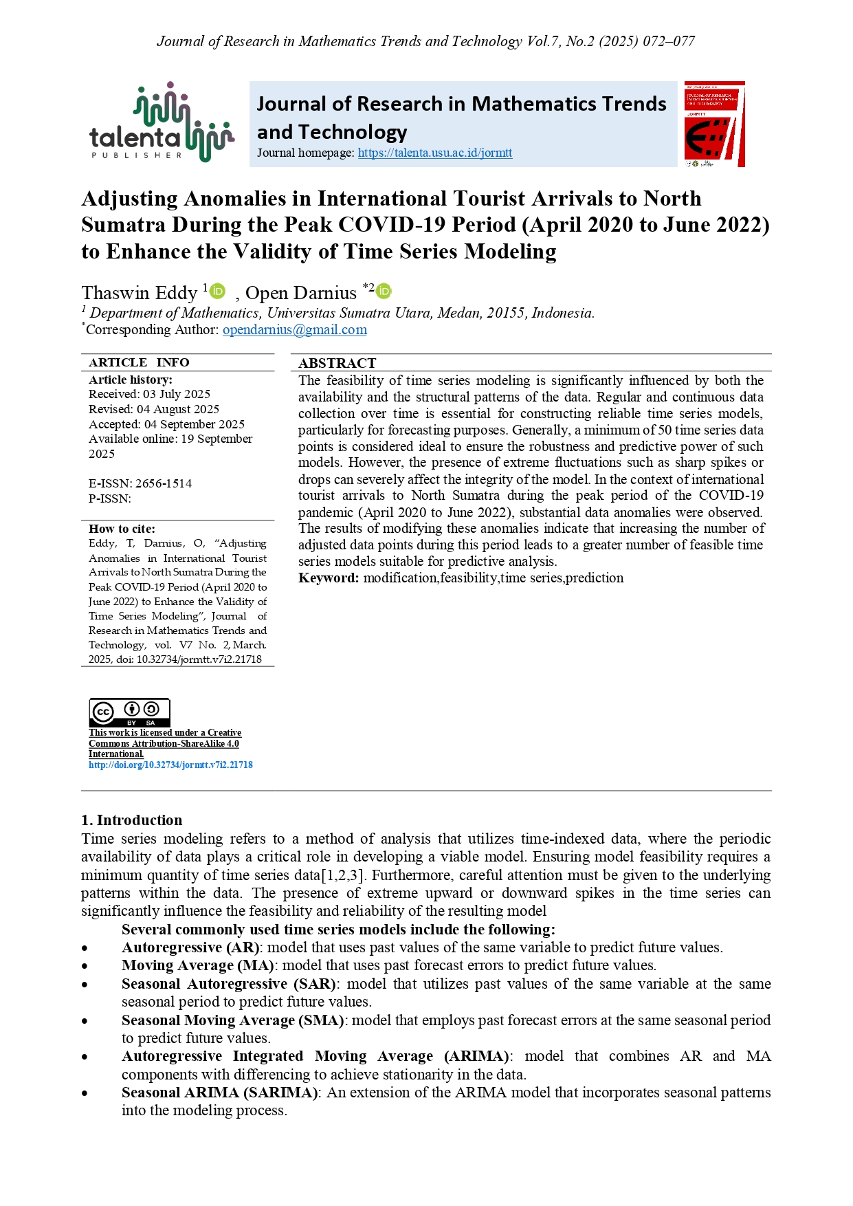TALENTA Publisher will publish every paper under the management of the Department of Mathematics, Faculty of Mathematics and Natural Sciences, Universitas Sumatera Utara. The frequency of the publishing is twice a year, which is in March and September.